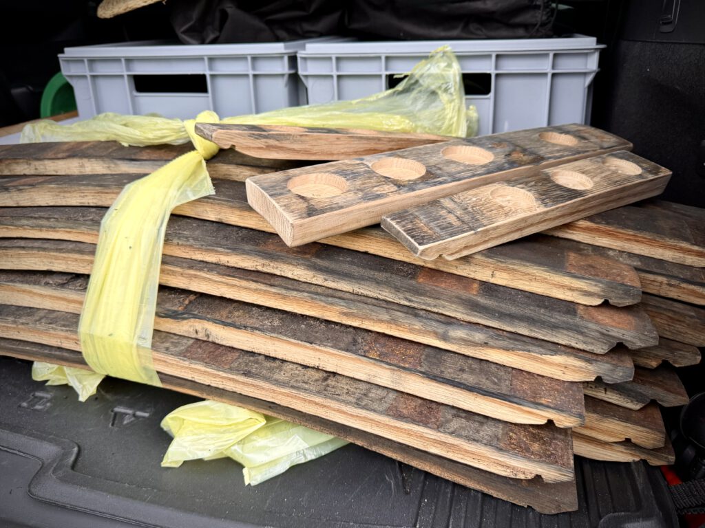 Per duig wordt gekeken voor welke Flight-tray deze het meest geschikt is, de smallere zijn bruikbaar voor de Flight tray Small, terwijl de bredere meer geschikt zijn voor de Flight tray Large. Afhankelijk daarvan wordt de juiste lengte én de diameter + locatie van de boorgaten bepaald. Bij tray’s die licht getordeerd zijn wordt een hoek geschuurd zodat deze vlak ligt. Afhankelijk van het te gebruiken Glencairn glaswerk worden de sparingen gefreesd. Dan wordt het geheel nogmaals geschuurd om scherpe randen te voorkomen, maar het authentieke uiterlijk te behouden.